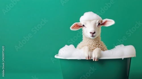 Adorable lamb relaxing in bathtub with soap foam and green background