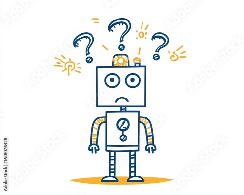 Cute line art of a confused robot with question marks above