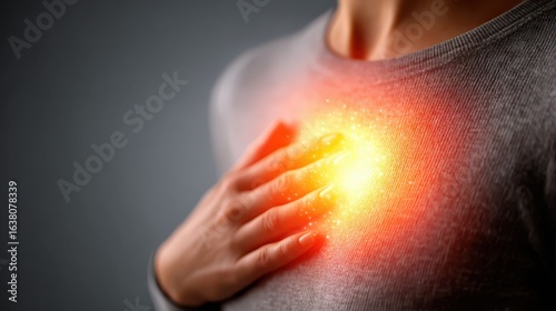 Hand placed on glowing chest symbolizing energy and healing in the heart