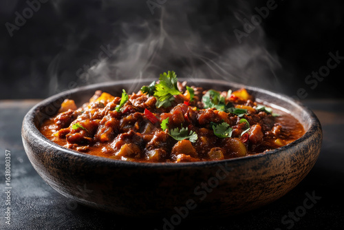 Delicious goulash served in a black bowl with vibrant garnishing