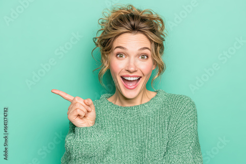 Smiling woman in a green sweater pointing against a mint green background