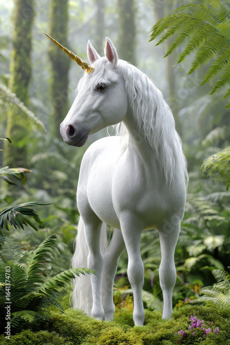 Majestic white unicorn standing in a lush green enchanted forest clearing