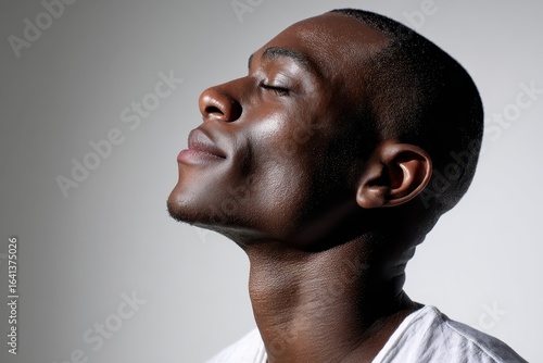 Young male with radiant skin in a studio setting, highlighting beauty and elegance against a dark background. Captures a serene and confident side profile with soft lighting.