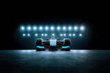 Formula racing car illuminated in blue lights on a dark atmospheric track