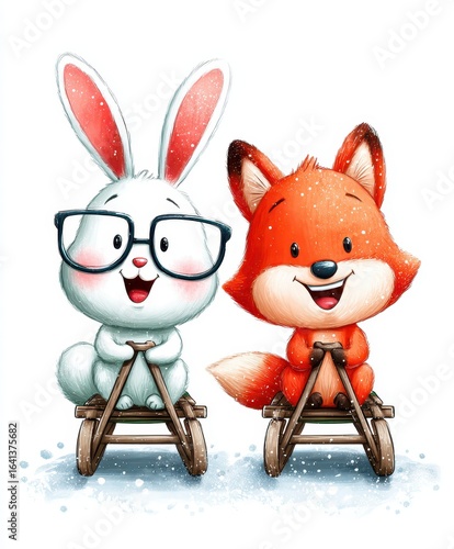 Happy cartoon rabbit and fox sledding in a winter wonderland