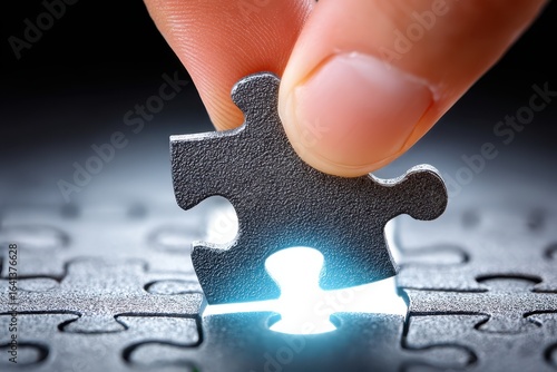 Hand placing final puzzle piece with glowing light underneath symbolizing completion