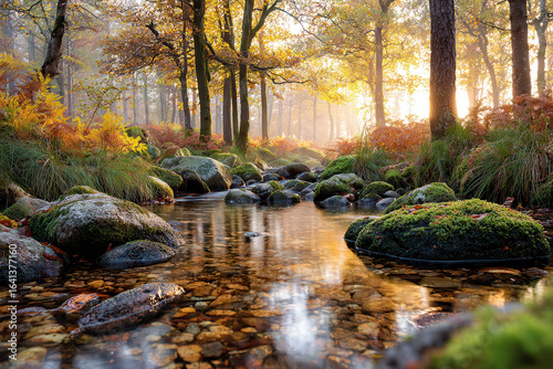 Sunlit stream surrounded by colorful autumn forest with mossy rocks