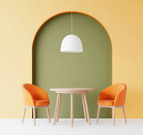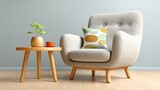 Comfortable armchair with pillow and wooden table in a cozy living space