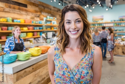 Smiling woman in store with shelves filled with colorful pottery and decor