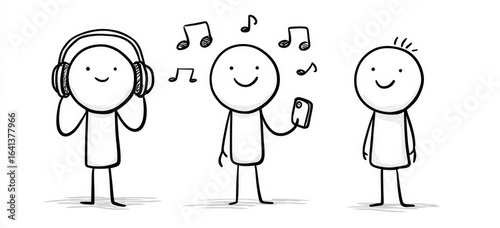 Stick figures enjoying music with headphones and a smartphone illustration