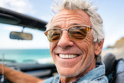 Casual bearded man in sunglasses enjoying a scenic drive in summer