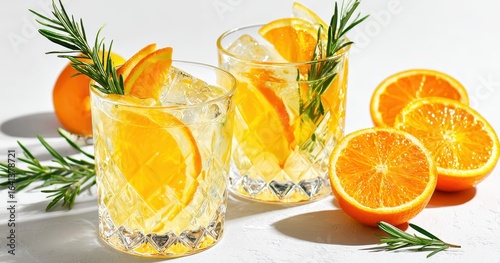 Fresh orange mocktails with rosemary garnished in crystal glasses on a sunny day