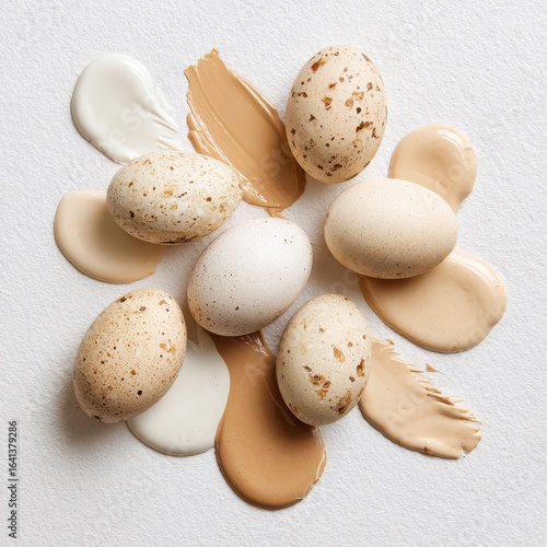 Speckled beige eggs arranged on paint swatches in a creative composition