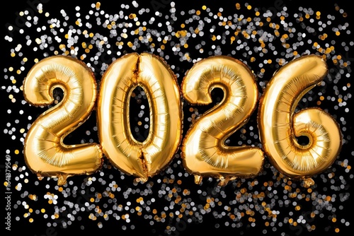 Golden foil balloons displaying year 2026 surrounded by festive silver confetti