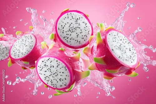 Fresh dragon fruit slices splashing in vibrant pink water on colorful background