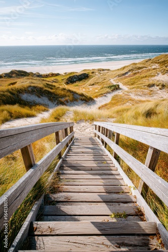 Wooden stairs leading to scenic sandy beach with ocean and dunes in background