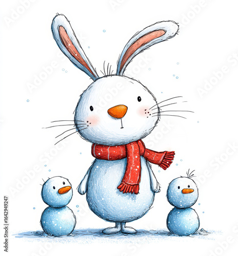 Adorable rabbit in a red scarf with snowman companions in winter setting