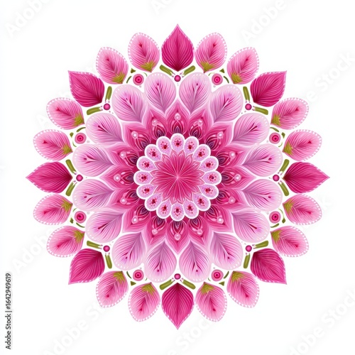 Pink mandala pattern featuring symmetrical floral details on a clean white background