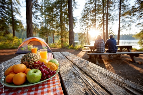 Serene camping scene with a tent and picnic at sunrise in the woods.
