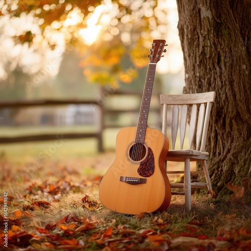 Acoustic guitar resting on a chair under a tree during autumn sunset