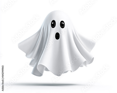Ethereal ghost shrouded in white cloth floating on a stark white background
