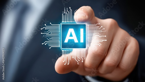 Businessman pointing at AI icon surrounded by futuristic digital networks