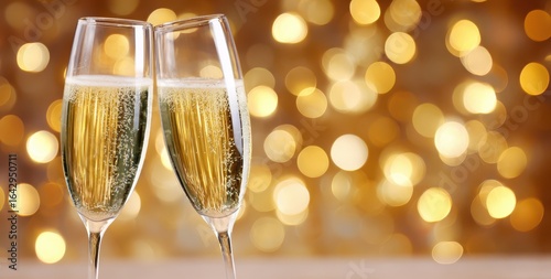 Two champagne glasses with sparkling bubbles against a golden festive background