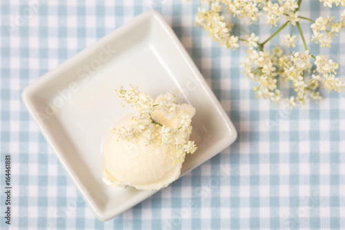 Kugel Holunderblüteneis mit frischen Holunderblüten