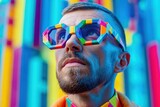 Portrait of man in geometric sunglasses with vibrant colors and style