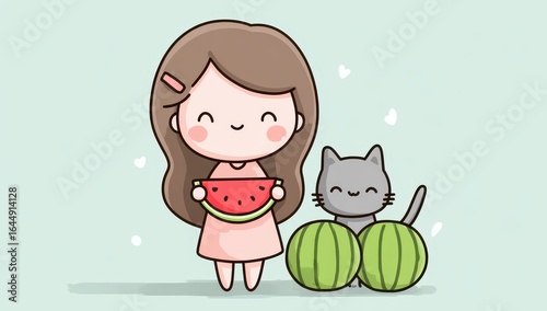 Cute cartoon girl with a watermelon slice and a smiling cat