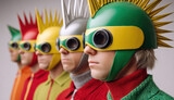 Group of artistic individuals wearing vibrant costumes and unique helmets