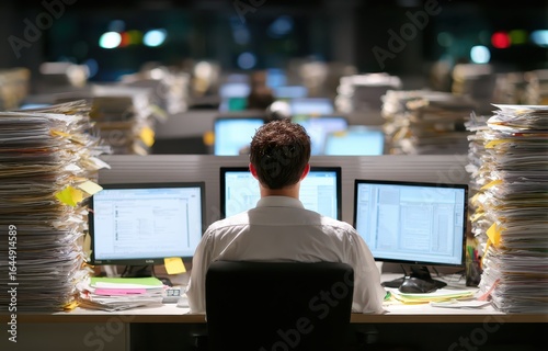 Focused professional analyzing financial data on multiple computer screens in a dark office