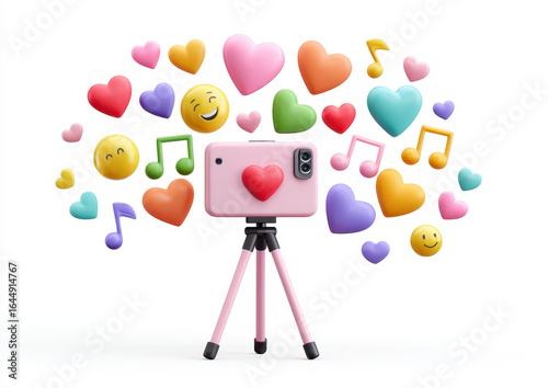Colorful emojis and hearts around a smartphone on a tripod