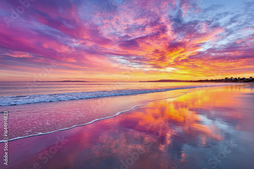 Vibrant sunset reflecting on a serene beach with vivid, colorful sky
