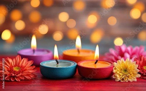 Colorful oil lamps and flowers glowing brightly in a vibrant celebration