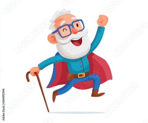 Joyful superhero senior enthusiastically leaping with a cane and a cape
