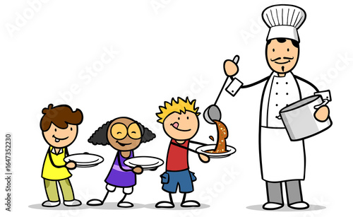 Cartoon Koch schenkt Kindern in Kindergarten Mittagessen aus