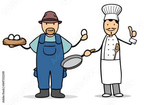 Cartoon Koch kauft Bio Eier vom regionalen Bauer