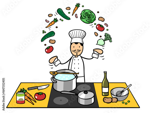 Cartoon Fernsehkoch jongliert mit Gemüse am Herd