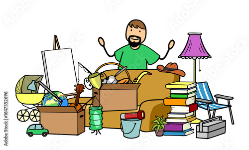 Cartoon Mann mit Hausrat für Verkauf auf Flohmarkt