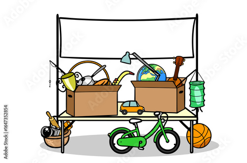 Cartoon Kind verkauft Spielzeug auf Kinderflohmarkt