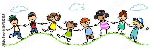 Gruppe Cartoon Kinder halten Hände auf Hügel in Natur