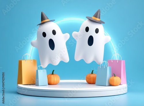 3D rendered Halloween-themed podium with ghosts, pumpkins, and shopping bags