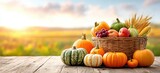 Autumn harvest scene with pumpkins, fruits, and fresh produce on a sunny day