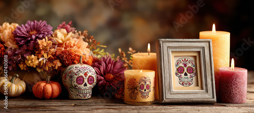 Colorful day of the dead altar with sugar skulls and holiday candles