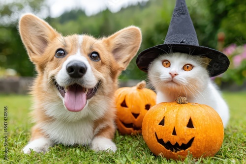 Corgi and cat dressed up with pumpkins for fun Halloween celebration