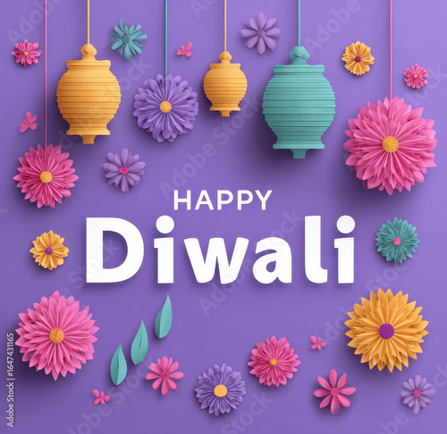 Bright and colorful Diwali illustration with flowers and decorative lighting decor