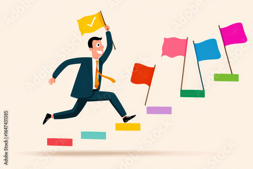 Cartoon man in business attire running on upward arrows representing career growth and success
