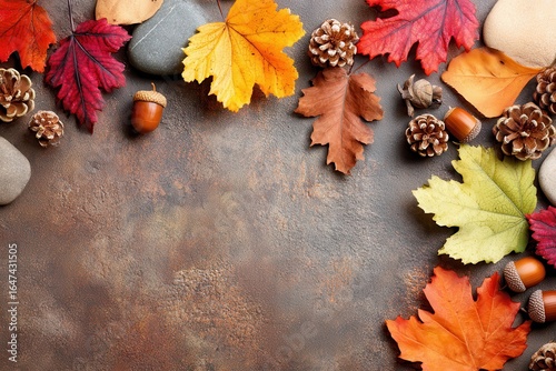 Autumn arrangement with colorful leaves, acorns, and pinecones on textured surface
