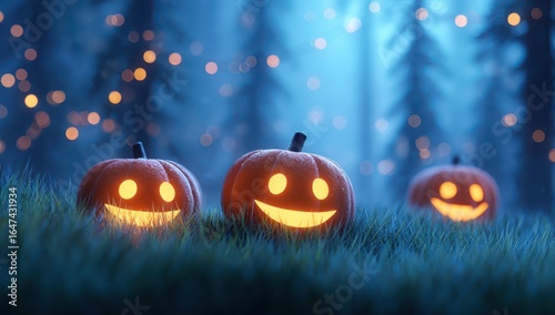 Playful glowing jack-o'-lanterns in a magical forest during Halloween